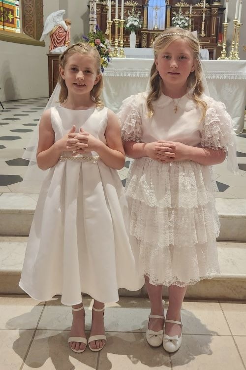 Students at St. Boniface Parish and St. Meinrad Parish made their First Holy Communion the weekend of May 3-4. In the bottom photo, from left, are Leah Woebkenberg and Ayla Schroer of St. Boniface Parish. In the top photo are the St. Meinrad Parish students, from left, Ty Weyer, Clay Sitzman, Isaac Collignon, Arlo Sermersheim, Thomas Lutz, and Beau Vaal.